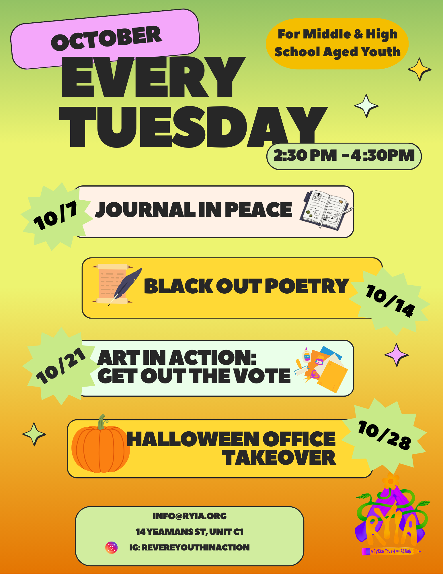 Mission Revere Youth in Action (RYiA) nurtures youth leadership, fosters transformative spaces, builds community defense, and advances social and environmental justice through collaborative action. Upcoming Events! Featured Oct 7 Oct 7, 2025 Journal In Peace Oct 7, 2025 Oct 7, 2025 Oct 18 Oct 18, 2025 Door Knock With Us - Local Elections Oct 18, 2025 Oct 18, 2025 Nov 3 Nov 3, 2025 Free Store Nov 3, 2025 Nov 3, 2025
